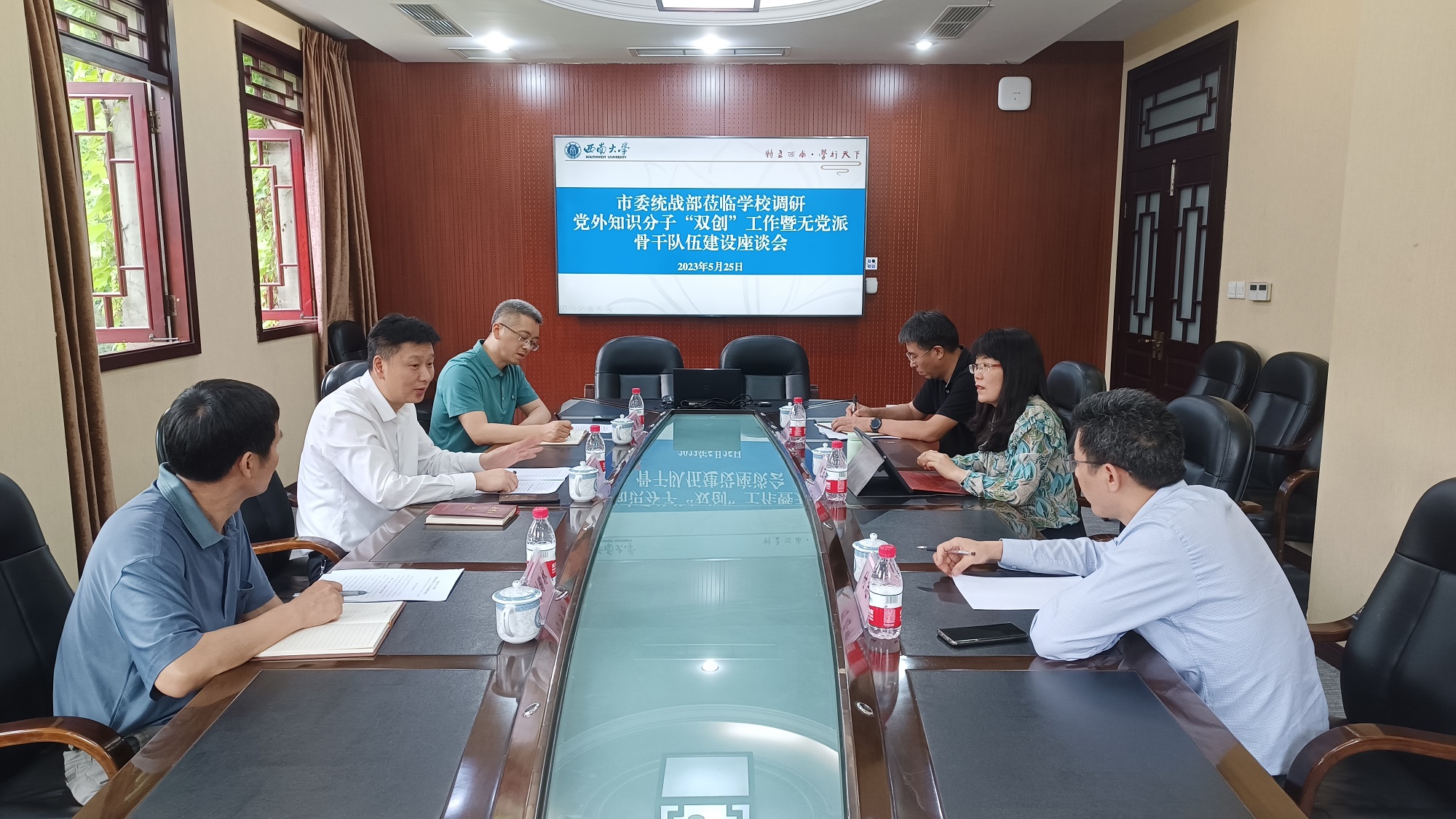 李旭锋代表学校党委对李康一行表示热烈欢迎,向市委统战部一直以来给予学校党政工作特别是统战工作的关心和指导表示感谢,并介绍了学校近年在人才培养、科学研究、改革创新等方面取得的成绩,交流了学校在党外知识分子思想政治引领等方面工作的思路举措和经验做法。李旭锋表示,学校将创新工作方法、打造品牌特色,继续做好新时代党外知识分子工作,持续推进党外代表人士队伍建设,希望市委统战部继续加强对学校各方面工作的支持和帮助,不断推动学校统一战线工作取得新成绩、实现新突破。