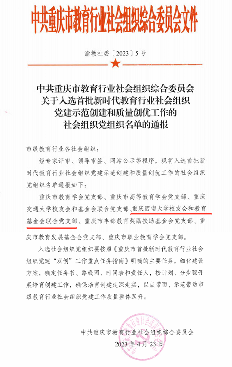 根据中共重庆市教育行业社会组织综合委员会通报,经专家评审、领导审签、网站公示等程序,重庆西南大学校友会和教育基金会联合党支部入选首批新时代教育行业社会组织党建示范创建和质量创优工作的社会组织党组织名单。