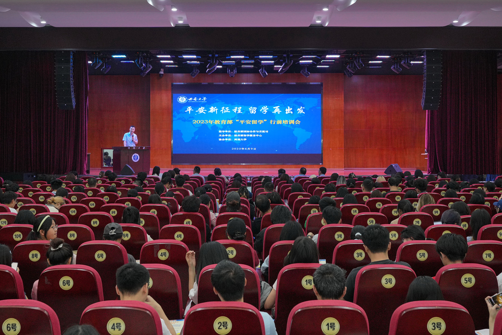 6月9日,以“平安新征程 留学再出发”为主题的2023年教育部“平安留学”行前培训会在校举办,400余名拟出国(境)交流学习的师生参加培训。重庆市北碚区出入境管理支队工作人员,学校人力资源部 党委教师工作部、研究生院 党委研究生工作部、学生工作处 党委学生工作部、团委、创新创业学院、国际合作与交流处 港澳台办等部门有关负责人出席会议。