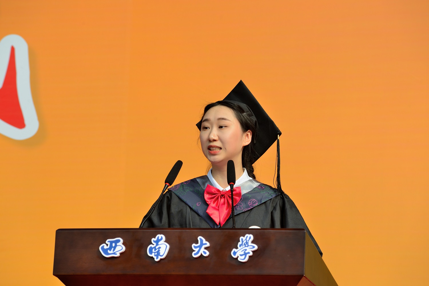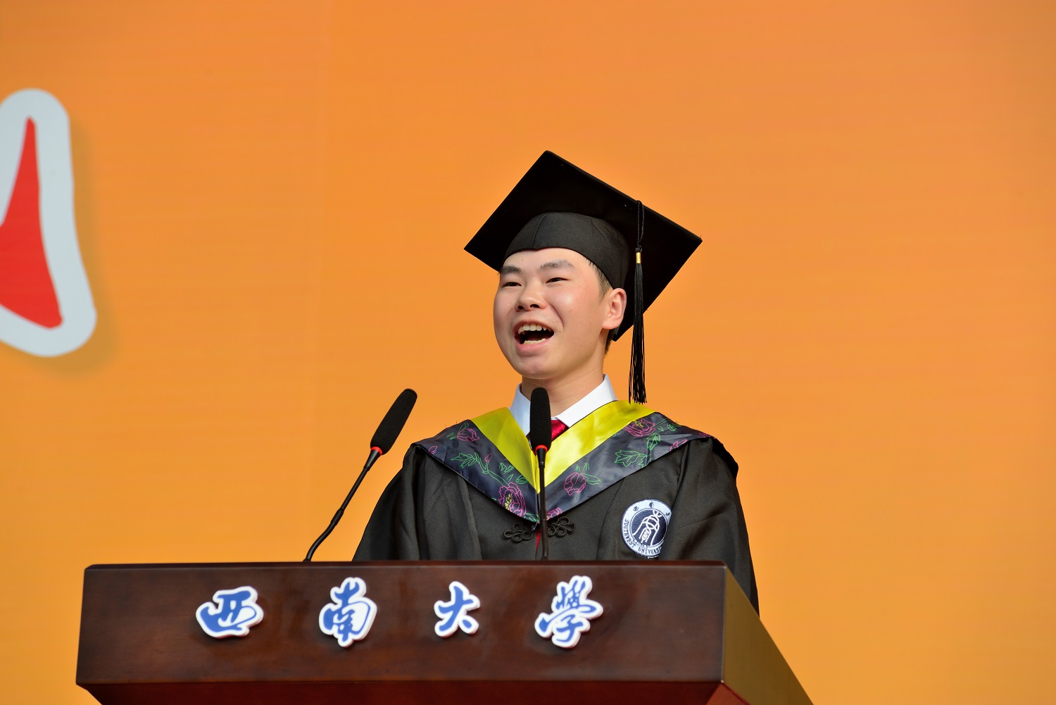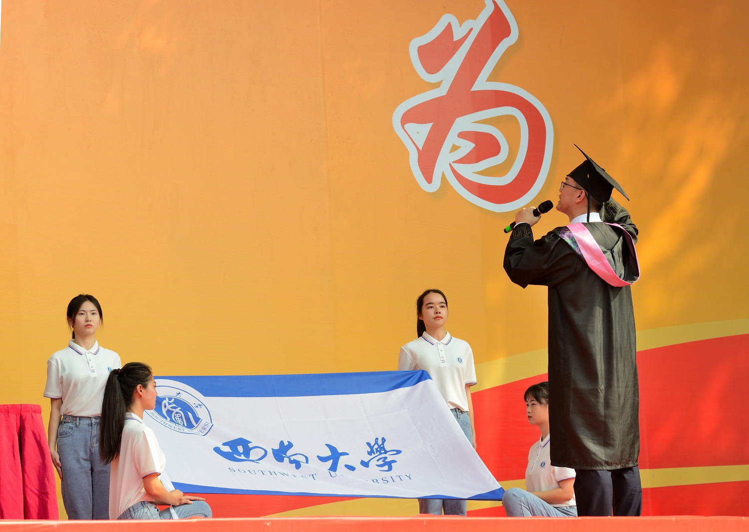 在毕业生宣誓环节,西南大学优秀毕业生、新闻传媒学院毕业生杨志远同学领誓,全体毕业生面向西南大学校旗铿锵有力地宣誓:“誓不负师长教诲,母校培养;誓不负国家期许,社会期望……”