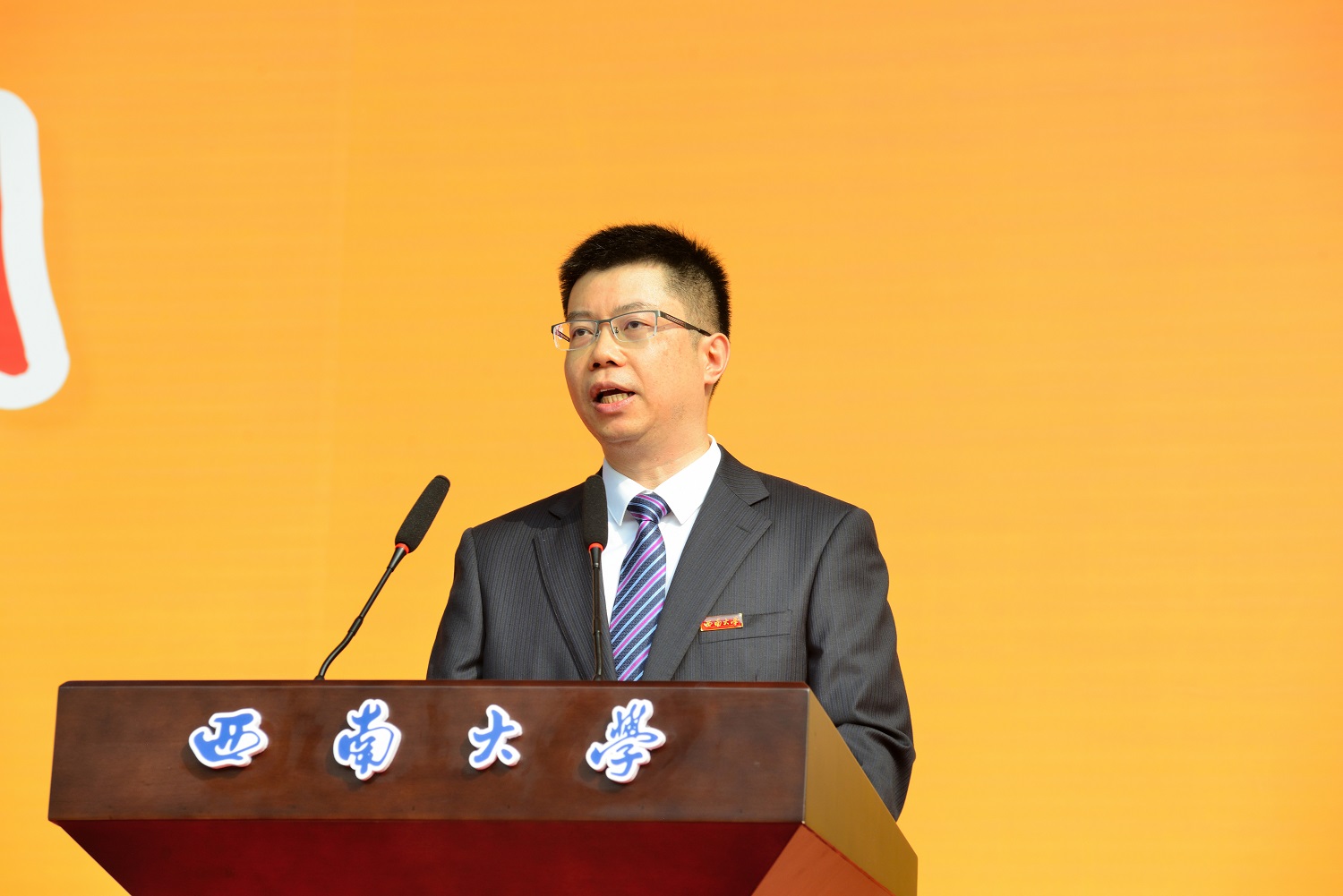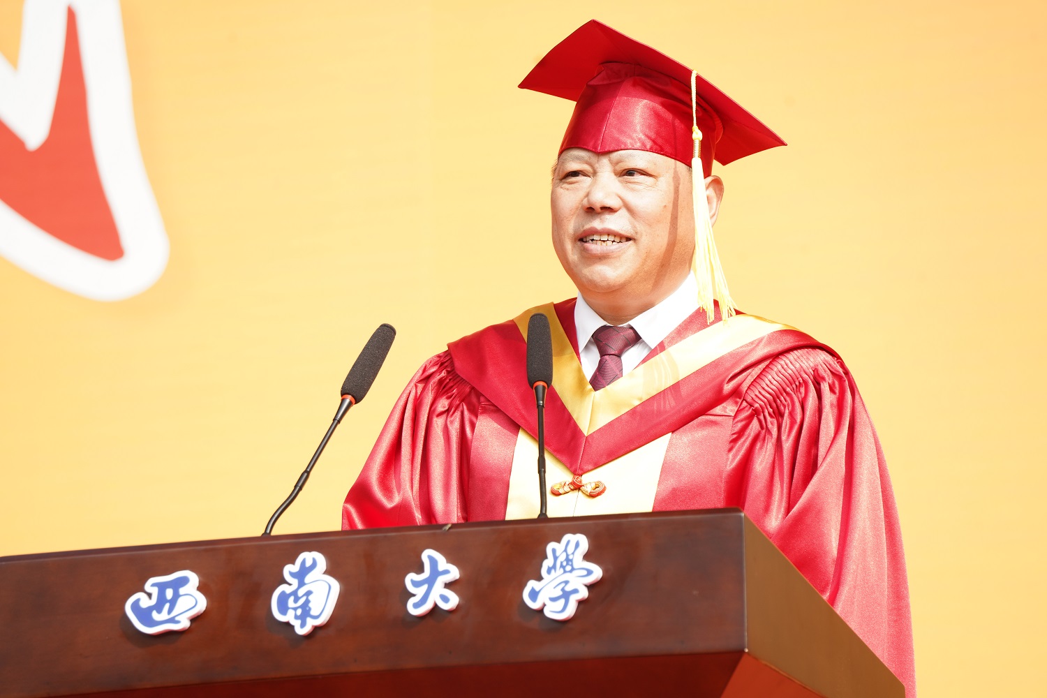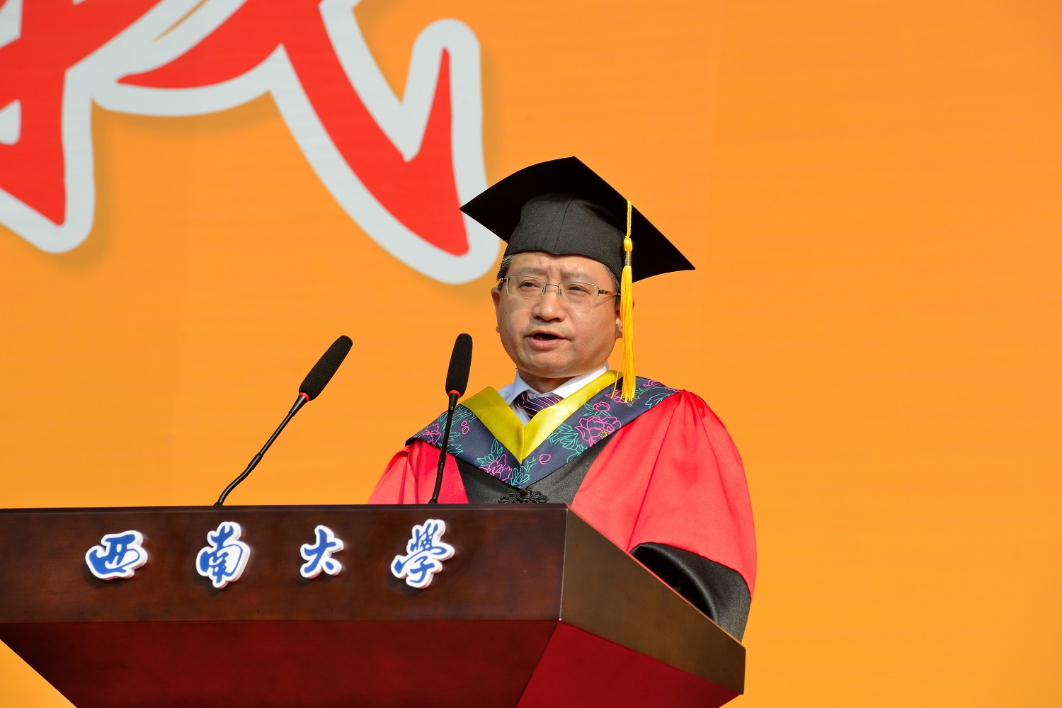 在毕业生宣誓环节,西南大学优秀毕业生、新闻传媒学院毕业生杨志远同学领誓,全体毕业生面向西南大学校旗铿锵有力地宣誓:“誓不负师长教诲,母校培养;誓不负国家期许,社会期望……”