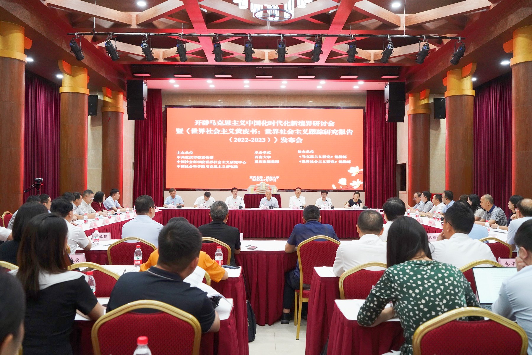 7月27日,“开辟马克思主义中国化时代化新境界”研讨会暨《世界社会主义跟踪研究报告(2022—2023)》发布会在学校召开。重庆市委常委、宣传部部长姜辉出席会议。西南大学校长张卫国致欢迎辞,中国社会科学院副院长甄占民、中共中央党校副校长李毅分别现场致辞,中国社会科学院原院长王伟光视频致辞,中国社会科学院原副院长、世界社会主义研究中心主任李慎明作会议主旨报告。