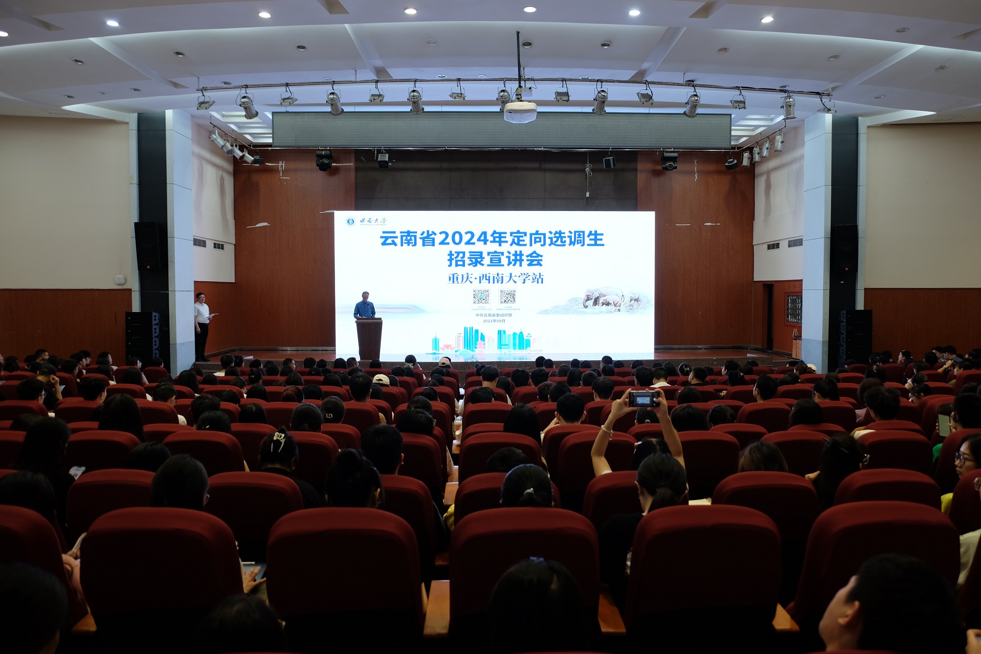 胡波代表云南省委组织部作云南省定向选调生招录宣讲。胡波结合云南省区位优势、资源环境优势、产业发展优势以及人才发展机遇等内容,全方位介绍了云南宜居、宜业良好环境,着重向大家解读了云南省人才引进和定向选调生招录政策,热烈欢迎西大学子到云南挥洒青春、成长成才。