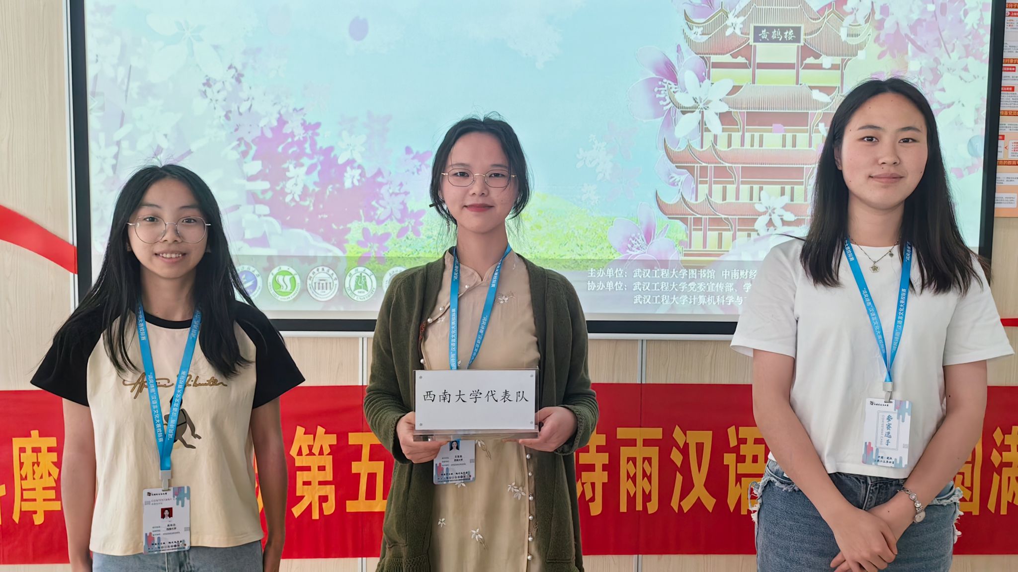 4月29日,学校学生线上参加了在武汉工程大学图书馆举办的第五届“词风诗雨”汉语言文化大赛总决赛,来自文学院汉语言文学专业的王盈盈同学在比赛中发挥稳定,荣获校际个人赛总冠军;白小雪、岳林芯获得校际个人赛优秀奖;王盈盈、白小雪、岳林芯组成的西南大学代表队在比赛中荣获团体赛冠军。