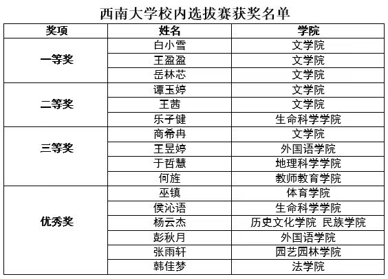 本届大赛于3月份启动报名,共有来自十二所高校的8000多名学生报名比赛,其中西南大学分赛区的比赛由学校图书馆学生管理委员会承办,在校内进行了赛前宣传动员并组织开展了海选赛、校内选拔赛,共有800多名学生参赛。经过近两个月的赛程,学校学生在比赛中表现突出,屡获佳绩。海选赛中11名满分选手就有5人来自西南大学,最终有3人代表学校参加了校际赛总决赛。
