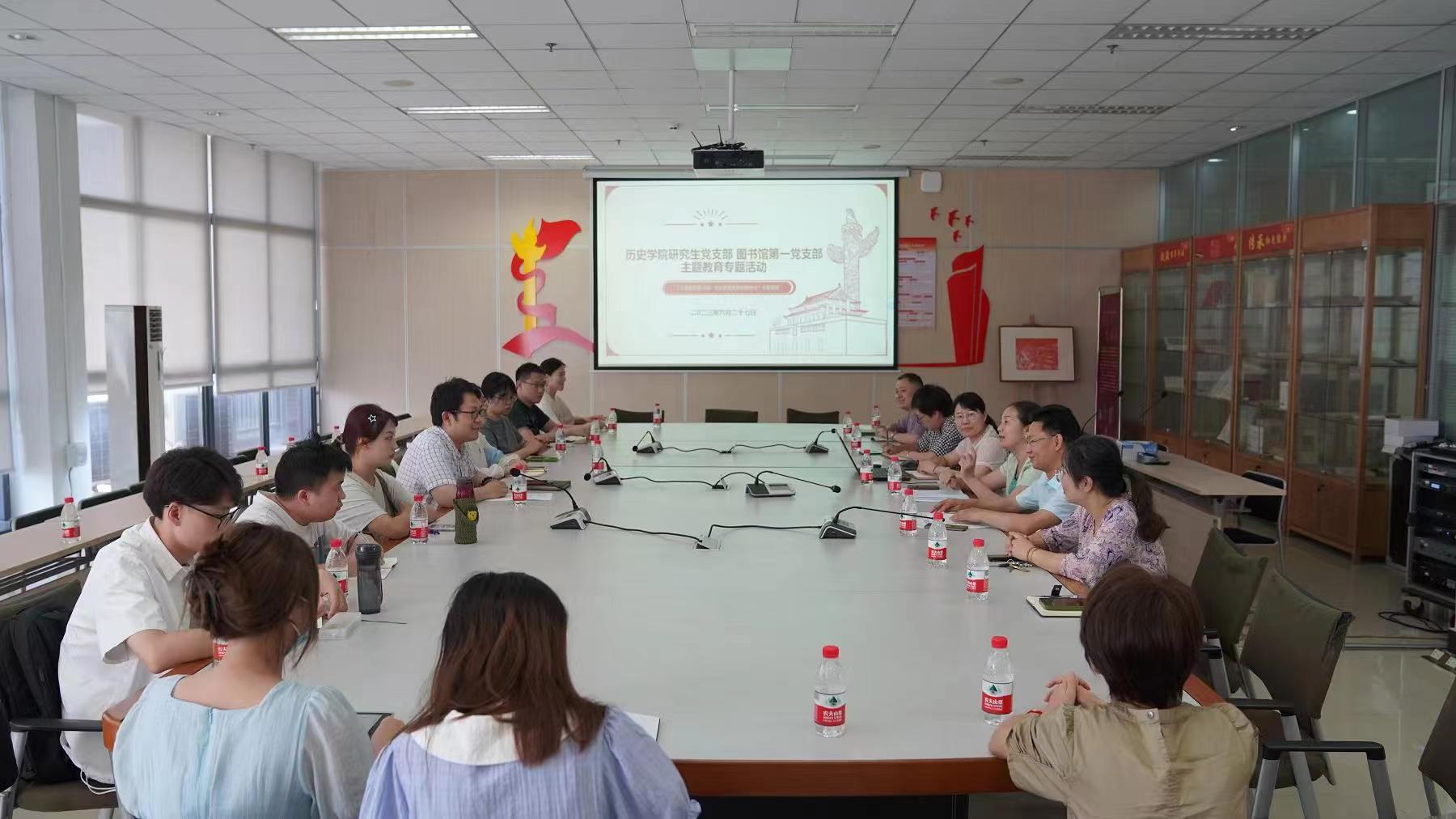 为扎实推进学习贯彻习近平新时代中国特色社会主义思想主题教育,进一步发挥党建引领作用,全面促进各项工作发展提升,6月27日下午,图书馆第一党支部与历史文化学院世界史研究生党支部、中国古代史研究生党支部、中国近现代史研究生党支部联合开展了学习贯彻习近平新时代中国特色社会主义思想主题教育调研交流会。图书馆党委书记梁大明、副馆长阚军,历史文化学院副院长、世界史研究生党支部书记李晶,以及各支部党员同志共计20余人参加了调研交流会。阚军副馆长主持会议。