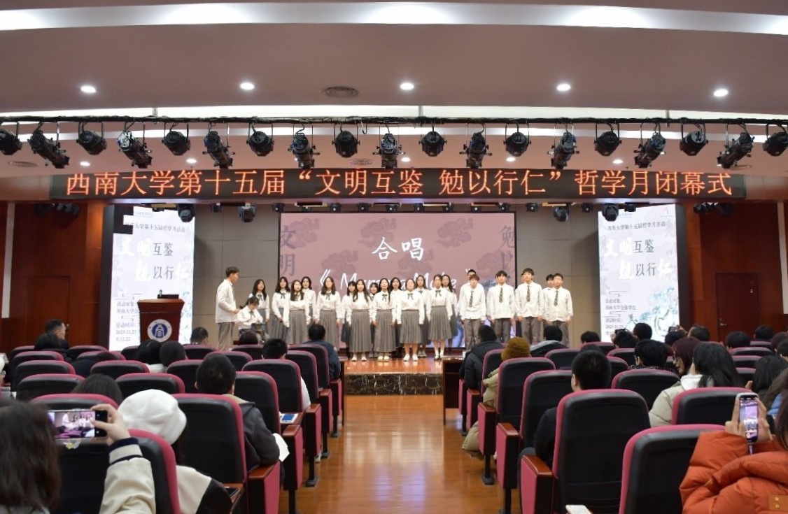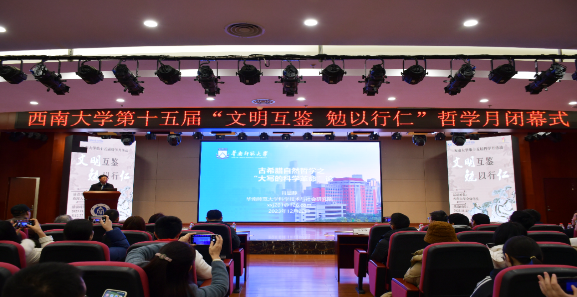 12月22日晚19:00,西南大学第十五届“文明互鉴·勉以行仁”哲学月闭幕式在校博物馆4楼报告厅隆重举行。华南师范大学特聘教授肖显静、校社科处副处长王作军、学生处助学中心主任孙金春、博物馆副馆长谭志敏、国家治理学院副院长郭美云、张永红、何健以及全校师生200余人参加了闭幕式。