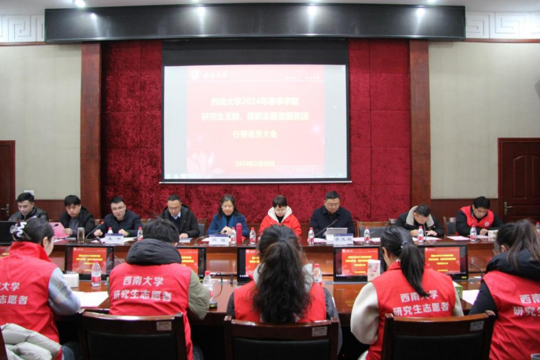 2月26日,2024年春季学期研究生支教、挂职志愿者服务团行前教育动员会在研究生院电子会议室线上线下同步召开。党委研究生工作部、国内合作处和相关培养单位负责人及服务团全体成员参加会议。