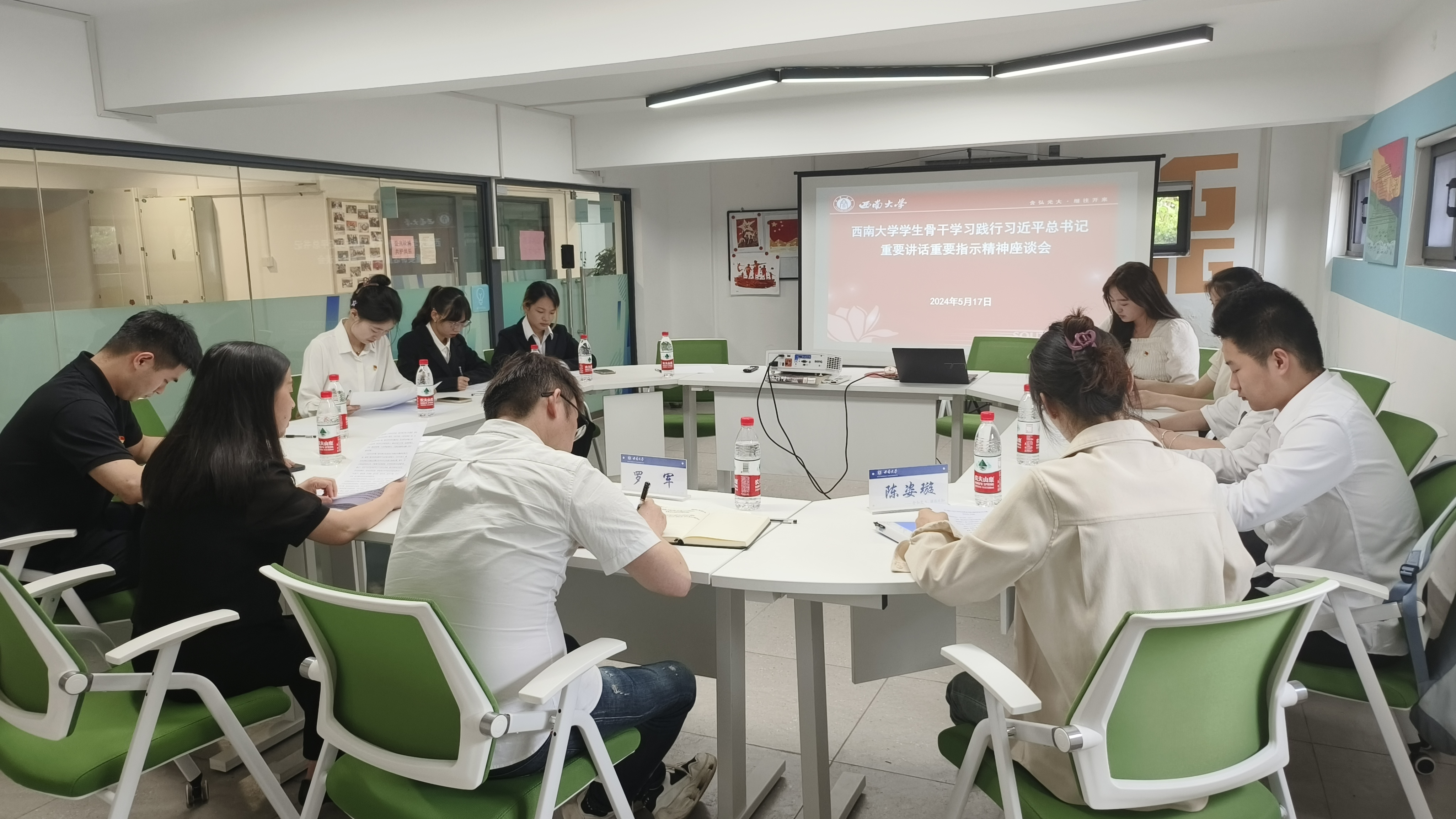 为深入学习习近平总书记视察重庆重要讲话重要指示精神及新时代推动西部大开发座谈会会议精神,贯彻落实习近平总书记对新时代青年重要寄语精神及对学校思政课建设作出的重要指示,不负习近平总书记对广大青年学子的殷切期待,2024年5月17日,西南大学学生骨干学习践行习近平总书记重要讲话重要指示精神座谈会在荣昌校区青樟空间召开,学校党委学生工作部(处)副部(处)长罗军、新闻传媒学院辅导员郭志聪、商贸学院辅导员陈姿璇出席会议,学生党员示范班代表、优秀学生标兵代表、荣昌校区学生骨干代表参加,会议由学校党委学生工作部(处)副部(处)长、荣昌校区学生工作办公室主任罗艳芬主持。