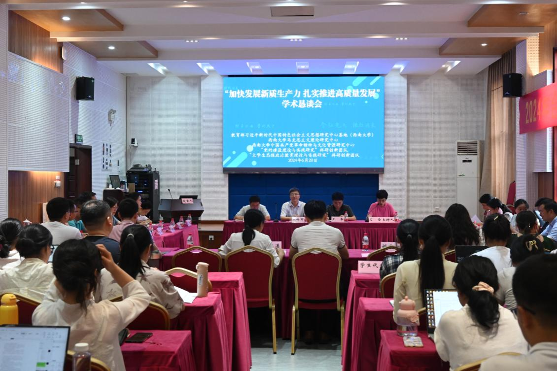 教育部习近平新时代中国特色社会主义思想研究中心基地(西南大学)崔健教授、马克思主义理论研究中心钟志凌教授与陈涛副教授、西南大学中国共产党革命精神与文化资源研究中心吴光会副教授依次就新质生产力的科学内涵、核心要义、显著特点、发展路径进行恳谈发言。从中外视野、新旧比对、系统思维与大历史观等维度对新质生产力重大理论命题进行了深刻的剖析和阐释,极大地深化和增进了关于新质生产力的理解和认识。