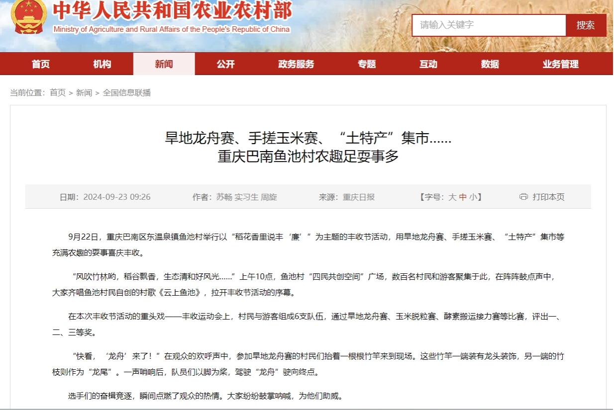 近日,西南大学乡村振兴战略研究院巴南基地成功举办了“稻花香里说丰‘廉’”主题丰收节,得到了农业农村部官网的报道。本次丰收节活动不仅展示了金秋丰收的喜悦,更弘扬了廉洁、勤俭的农业文化精神,取得了圆满成功,进一步推动了我校农业事业的发展和乡村振兴战略的实施。