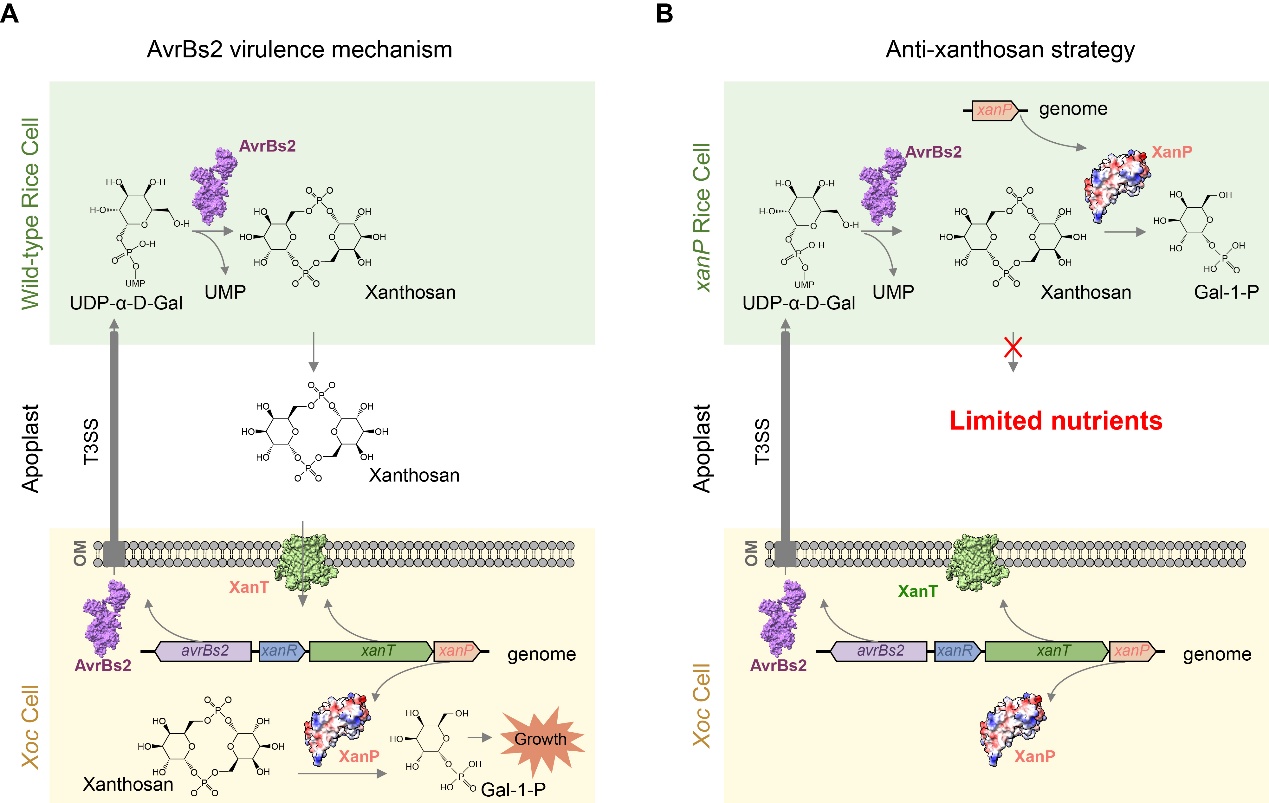 王善之及其合作团队最新研究发现,AvrBs2实际上是一种未被鉴定的磷酸糖酯合成酶。该蛋白在被分泌至植物细胞后,可合成一种环状半乳糖磷酸二酯类化合物——研究团队将其命名为“黄单胞糖”。黄单胞糖随后借助植物细胞的转运系统,被输送至水稻叶片组织的质外体空间。进一步研究揭示,黄单胞糖作为一种细菌专用营养,可被Xoc的细胞外膜转运蛋白XanT吸收,继而在细菌内被特异性磷酸二酯酶XanP水解为D-半乳糖-1-磷酸,最终被Xoc代谢利用,为其生长提供能量。